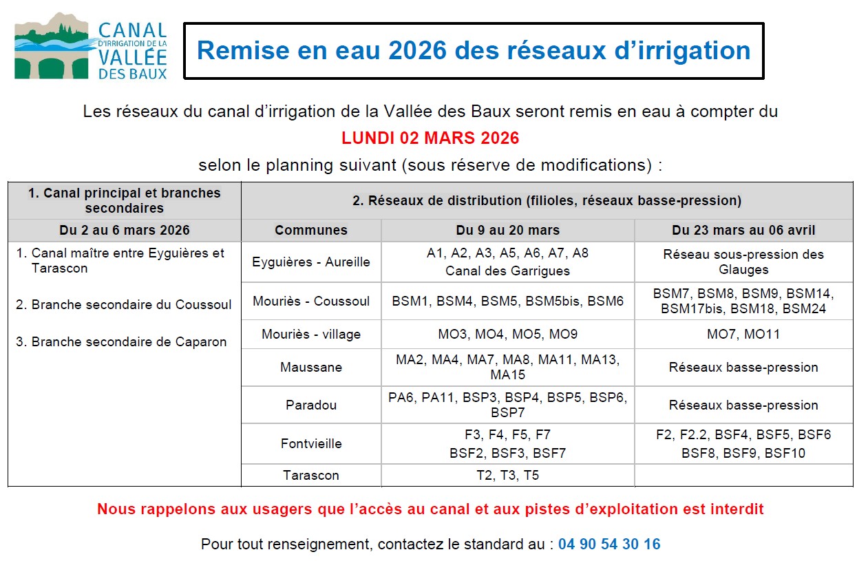 Nous vous informons que le canal d’irrigation de la Vallée des Baux sera remis en eau à compter du lundi 2 mars 2026, sauf intempéries ou cas de force majeure.